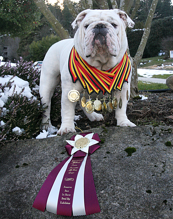 Each dog receives a written critique from the judge and they are judged according to the standard for their breed. There is no requirement that other dogs be defeated to attain a championship, however judges do grant placements and choose Best of Breed winners who go on to compete at the Group and Best In Show levels. Awards are also given to the Best Bred-By-Exhibitor entries at the breed, group and BIS levels. With smaller entries Group placements and even a chance at Best in Show honors is within reach if you have a good quality dog. Two of our Sittingbullies boys, Gabe and his grandson Pirate, each earned a Reserve Best In Show BBE Award at an International Show.